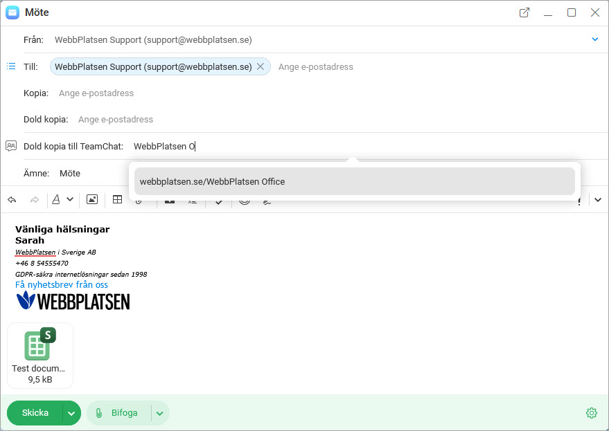 Du kan också skicka ett e-postmeddelande till en mottagare och samtidigt skicka en dold kopia till ett TeamChat-rum. Skapa ett e-postmeddelande, ange mottagaren i Till: fältet och skriv namnet på TeamChat-rummet i Hemlig kopia till TeamChat: fältet.