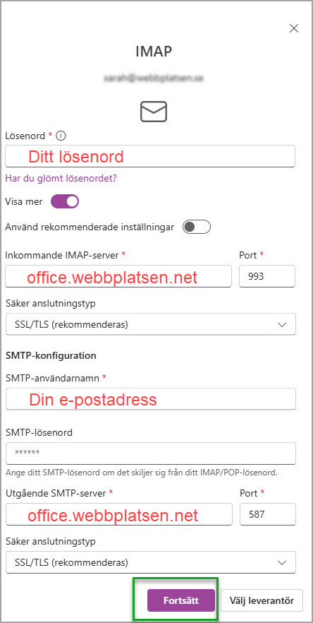 - Fyll i uppgifterna enligt nedan. Notera att servern heter office.webbplatsen.net
