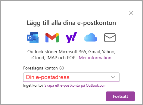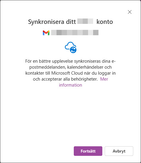För att lägga till ett e-postkonto i nya Outlook så tvingas du att synka din e-post till Microsoft moln. Vi avråder ifrån att ni delar ert data med Microsoft.