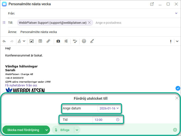 • Välj datum och klockslag >Skicka med fördröjning