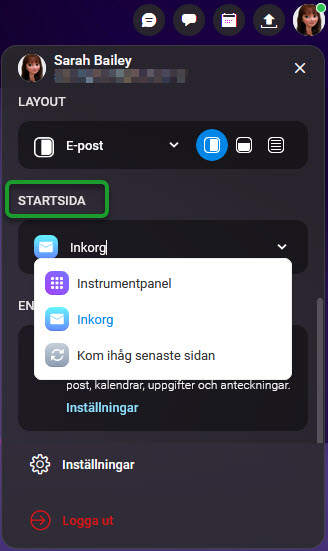 Du kan enkelt välja vad som ska visas när du loggar in på ditt konto. De tre alternativen är Instrumentpanelen, Inkorgen eller Kom ihåg senaste sidan.